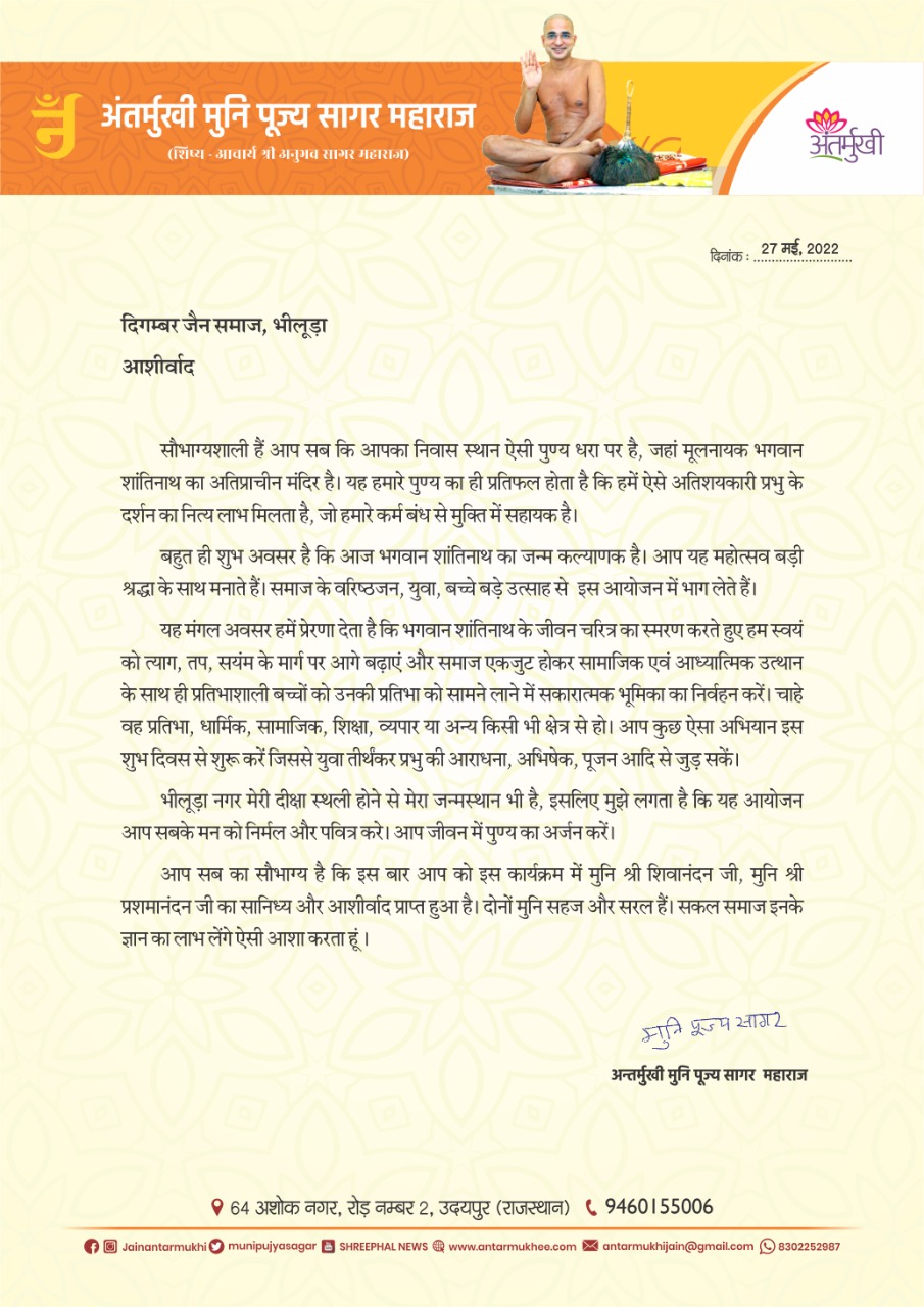 भीलूड़ा नगर मेरी दीक्षा स्थली होने से मेरा जन्मस्थान भी है, इसलिए मुझे लगता है कि यह आयोजन आप सबके मन को निर्मल और पवित्र करे। आप जीवन में पुण्य का अर्जन करें।