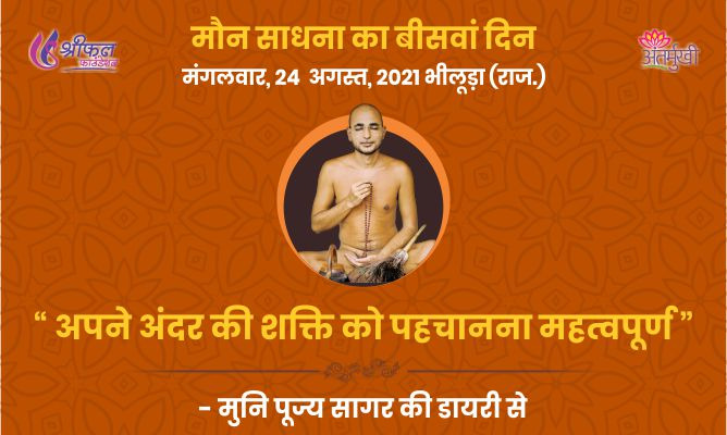अन्तर्मुखी की मौन साधना का 20वां दिन। साधना में अनुभूति हुई कि अगर हमारा ध्यान प्रबल है तो बाहर के किसी भी तरह का हो-हल्ला आत्मा की अनुभूति से नहीं रोक सकता है। जब हम स्वयं में अंदर से विचलित होते हैं तभी हम बाहर से विचलित होते हैं। अंतरंग की स्थिरता के लिए संसार के सुखजनित साधनों, बातों, कार्य और चिंतन से दूर होना चाहिए। अंतरंग से कषाय का त्याग, राग-द्वेष का त्याग, शरीर सुख का त्याग करने पर बाहर की अनुभूति नहीं होती है। इन्द्रिय सुख की चाह में हम स्वयं एकाग्र नहीं हो पाते। उसका कारण हम कुछ और बता देते हैं। यही हमारी कमजोरी है। इससे लड़ने के बजाए हम डर जाते हैं तो और ज्यादा कमजोर होते जाते हैं। अंदर की निर्मलता ही मलिन होती जाती है।
