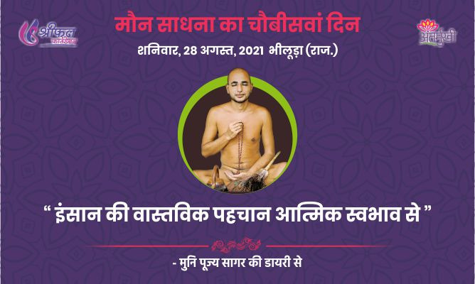 मौन साधना का 24वां दिन। इंसान की वास्तविक पहचान उसके आत्मिक स्वभाव से होती है। आत्मिक स्वभाव मिलने पर वह फिर कभी नाश को नहीं प्राप्त होता है। आत्मिक स्वभाव की बाहरी पहचान, इंसान की भाषा,शब्द संयोजन,आचरण, व्यवहार,शरीर की क्रिया आदि से होती है। आत्मिक स्वभाव कर्मरहित है। कर्म के कारण आत्मिक स्वभाव विकृत हो जाता है। इंसान के पास धन, वैभव, रूप सब कुछ कर्म के अनुसार आता- जाता रहता है। इन्हीं के कारणआत्मिक स्वभाव मलिन हो जाता है। यह चीजें कुछ समय तक तो इंसान को आकर्षित कर सकती हैं, पर स्थाई रूप से नहीं।