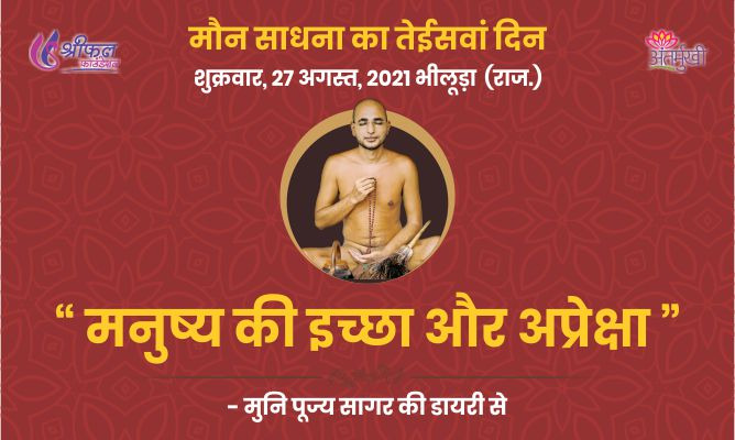 मौन साधना का 23वां दिन। इंसान के जन्म लेने के साथ ही उसके कुछ अपने लोग उससे अप्रेक्षा रखना शुरू कर देते हैं। जब वह समझदार हो जाता है तब उसकी अपनी इच्छा होती है। यह सब कुछ दिन नहीं, जन्म से लेकर मरण तक चलता ही रहता हैं। यह इच्छाएं और अप्रेक्षा एक, दो, तीन नहीं बल्कि अनेक होती हैं जिसकी गणना नहीं की जा सकती। जिसकी गणना नहीं की जा सकती तो उसका अनन्त कैसे हो सकता है? साथ ही, यह हर समय एक सी नहीं होती,  बदलती रहती है। कभी समय के अनुसार तो कभी मजबूरी में, कभी परिस्थितियों के कारण तो कभी कर्म के कारण। ऐसी स्थिति में इंसान का कोई लक्ष्य ही नहीं रहता है और लक्ष्य हो भी तो वह उससे भटक जाता है।