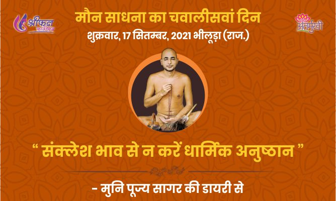 मौन साधना का 44वां दिन। धार्मिक कार्यों में अपने- अपने मनमुटाव या धार्मिक अनुष्ठान में लाभ-हानि का हिसाब देखेंगे तो धार्मिक अनुष्ठान में संक्लेश होगा। संक्लेश भाव से किया धार्मिक अनुष्ठान कर्म निर्जरा का कारण भी नहीं बनता और न ही प्रभावना का कारण बनता है। बल्कि इस प्रकार से किए जाने वाले अनुष्ठान समाज को तोड़ने का काम करते हैं। न जाने किस कर्म के उदय से इंसान धार्मिक अनुष्ठान करने से पहले नकारात्मक सोच रखते हैं। पूर्व भव में मुनियों को आहार देने के एक कार्य के चलते राम को वनवास जाना पड़ा। अंजना ने पूर्व भव में जिनेन्द्र की प्रतिमा का अपमान किया तो उसे भी गर्भ अवस्थान में जंगल में भटकना पड़ा, ऐसे कई उदाहरण हैं।