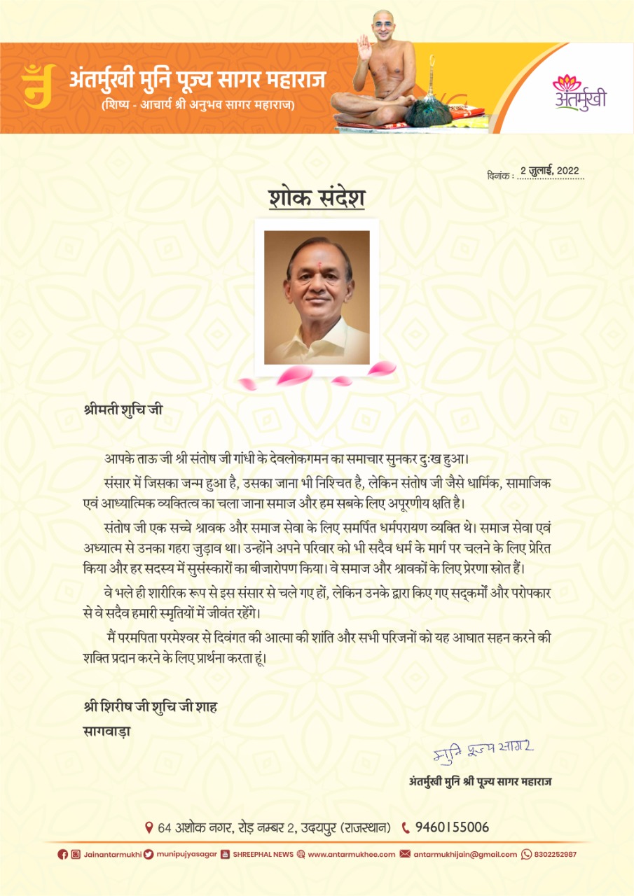 आपके ताऊ जी श्री संतोष जी गांधी के देवलोकगमन का समाचार सुनकर दुःख हुआ।