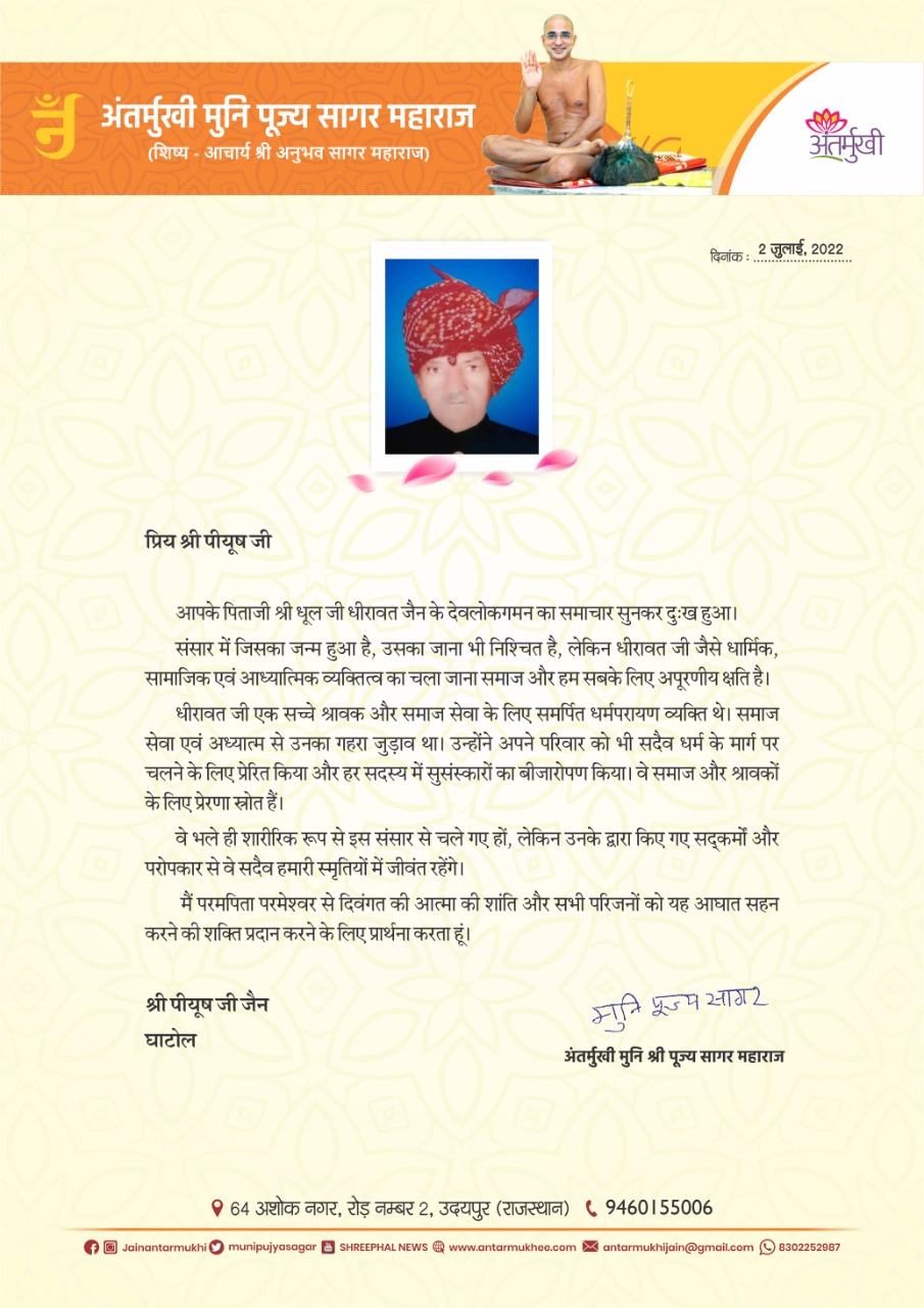आपके पिताजी श्री धूल जी धीरावत जैन के देवलोकगमन का समाचार सुनकर दुःख हुआ।