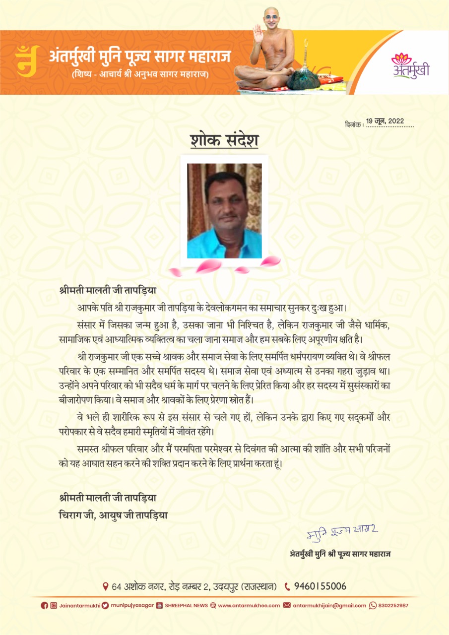 आपके पति श्री राजकुमार जी तापड़िया के देवलोकगमन का समाचार सुनकर दुःख हुआ।