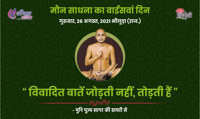 मौन साधना का 22वां दिन। विवादित बातों पर जवाब देने की प्रवृत्ति मनुष्य के मन, मस्तिष्क को विचलित कर देती है, इस परिस्थिति में नकारात्मक सोच का ही जन्म होता है। विवादित बातें रबड़ की तरह होती हैं- जितना खींचो, खिंचती चली जाती है। पर जब खिंचने की लिमिट समाप्त हो जाती है तो वह टूट जाती है। एक रबड़ के दो टुकड़े हो जाते हैं, फिर वह रबड़ किसी काम का नहीं रहता है। विवादित बातों में मनुष्य की वाणी से निकलने वाले शब्दों की मर्यादा टूट जाती हैं। ऐसा लगता है कि मानव के वेश में वह राक्षस हो। लज्जा, शर्म, मानवता धीरे- धीरे दूर होते चले जाते हैं। स्वच्छन्द प्रवृत्ति से वह जीना शरू कर देता है। ऐसी स्थिति में मनुष्य का अपनी जाति, धर्म, परिवार, संस्कार, संस्कृति के प्रति अभिमान नहीं बचता है। मनुष्य की यह प्रवृत्ति उसे धीरे-धीरे अपने समाज की गतिविधियों से दूर ले जाती है, उसमें नकारात्मक सोच हावी हो जाती है। एक दिन वह अपने परिवार की पहचान और सम्मान को खो देता है।