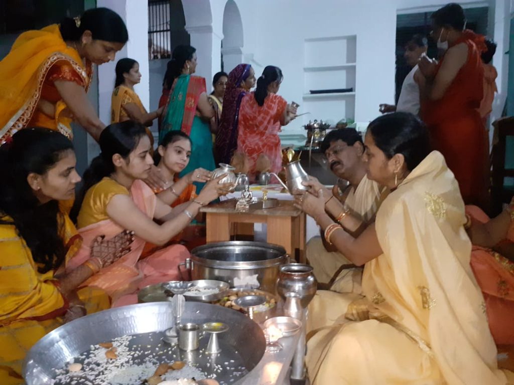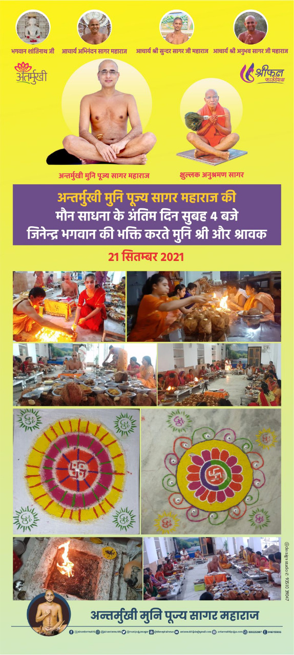भीलूड़ा। अन्तर्मुखी पूज्य सागर महाराज के 48 दिवसीय मौन साधना के अंतिम दिन सुबह चार बजे से भक्तामर विधान के अंतर्गत अर्घ्य, दीपक,नैवैद्य से भगावान आदिनाथ की पूजन किया गया। चौबीस तीर्थंकर का पूजन, तीर्थंकर के 1000 हजार नाम मन्त्रो की आहुति और अर्घ्य चढ़ाए गए, 56 पकवानों से भी आराधना की गई। उल्लेखनीय है कि अन्तर्मुखी मुनि पूज्य सागर महाराज 5 अगस्त से 21 सितम्बर तक लगातार की मौन साधना कर रहे हैं। मुनि श्री के साथ इस आराधना में क्षुल्लक अनुश्रमण सागर महाराज और समाज के अन्य लोग शामिल होते थे। इन 48 दिनों में मुनि श्री के द्वारा कई प्रकार के मंत्रों का जाप किया गया।तुष्टि जैन ने बताया कि मुनि श्री 12 वर्षों से इस प्रकार की 48 दिन की साधना कर रहे हैं। मुनि श्री ने इस साधना का प्रारंभ श्रवणबेलगोला से किया था, तब वह क्षुल्लक अतुल्य सागर महाराज के नाम से जाने जाते थे। मुनि श्री को इस साधना की प्रेरणा श्रवणबेलगोला के भट्टारक चारुकीर्ति स्वामी को देखकर मिली। वह भी मौन साधना करते थे। उनसे प्रेरित होकर मुनि श्री ने भी यह साधना प्रारम्भ कर दी। मुनि श्री मौन साधना के साथ एक उपवास और एक दिन अन्न के त्याग के साथ आहार ग्रहण करते थे। इन 48 दिनों में 24 उपवास और 24 दिन अन्न का त्याग रहा। आचार्य सुंदर सागर महाराज,आचार्य अनुभव सागर महाराज के आशीर्वाद से यह साधना मुनि श्री ने पूरी की है।