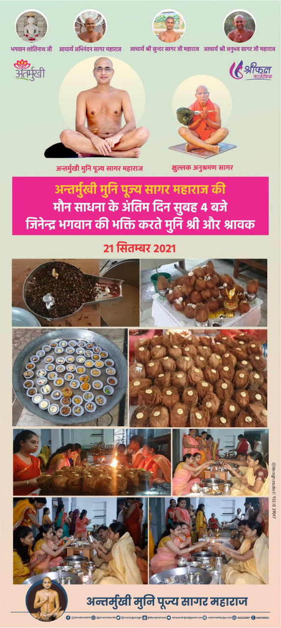 अन्तर्मुखी मुनि पूज्य सागर महाराज प्रतिदिन मौन साधना में मुनि जाप, हवन,पाठ,भक्ति, लेखन से अपने भावों को निर्मल करते थे। दैनिक भास्कर, डूंगरपुर ने मुनि श्री के 48 दिन के चिंतन को प्रतिदिन प्रकाशित किया जो संग्रहणीय है। इसी क्रम में समाज के 48 परिवारों ने भी भक्तामर विधान कर 2,688 अर्घ्य भगवान आदिनाथ को समर्पण किए। मुनि श्री की मौन साधना आज पूर्ण हो जाएगी, पर अन्य साधना का क्रम जारी रहेगा। मुनि श्री की इस साधना में, समाज द्वारा 48 दिन की जो आराधना की जा रही है, वह भी 25 सितम्बर को पूर्ण होगी।
