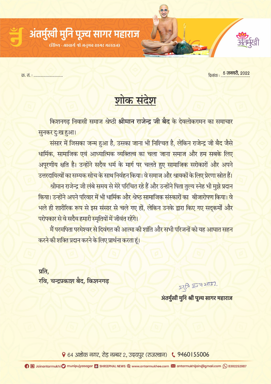 संसार में जिसका जन्म हुआ है, उसका जाना भी निश्चित है, लेकिन राजेन्द्र जी बैद जैसे धार्मिक, सामाजिक एवं आध्यात्मिक व्यक्तित्व का चला जाना समाज और हम सबके लिए अपूरणीय क्षति है। उन्होंने सदैव धर्म के मार्ग पर चलते हुए सामाजिक सरोकारों और अपने उत्तरदायित्वों का सम्यक सोच के साथ निर्वहन किया। वे समाज और श्रावकों के लिए प्रेरणा स्रोत हैं।