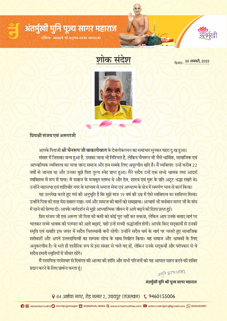 आपके पिताजी श्री चैनरूप जी बाकलीवाल के देवलोकगमन का समाचार सुनकर गहरा दुःख हुआ।