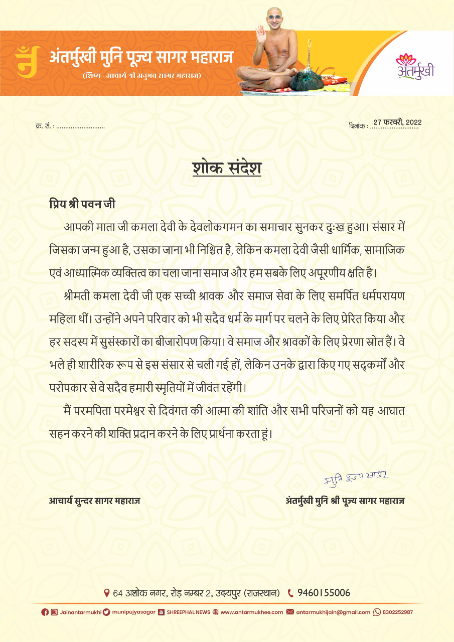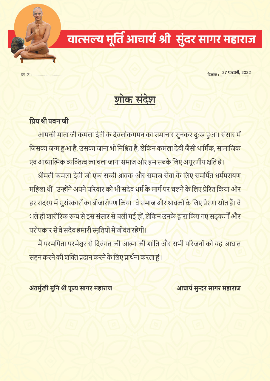 आपकी माता जी कमला देवी के देवलोकगमन का समाचार सुनकर दुःख हुआ।