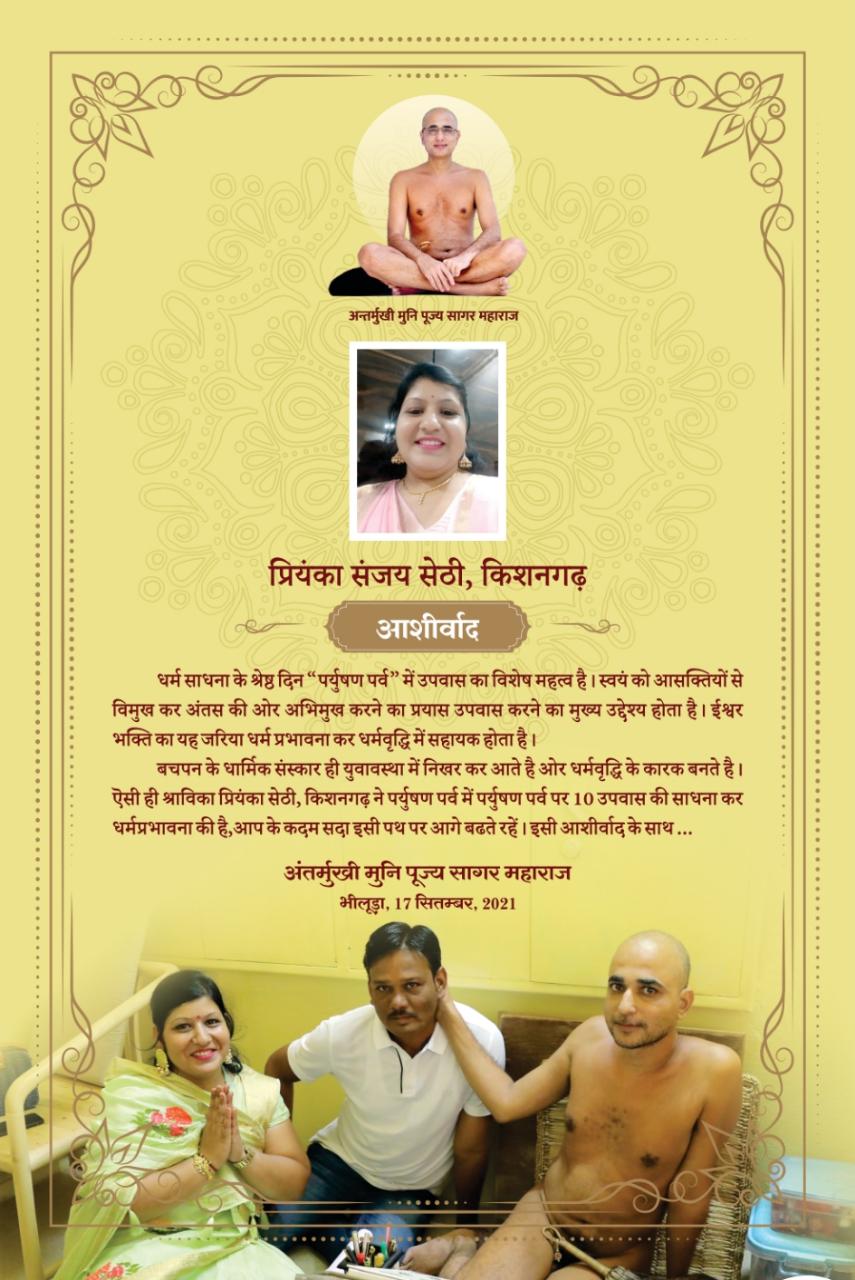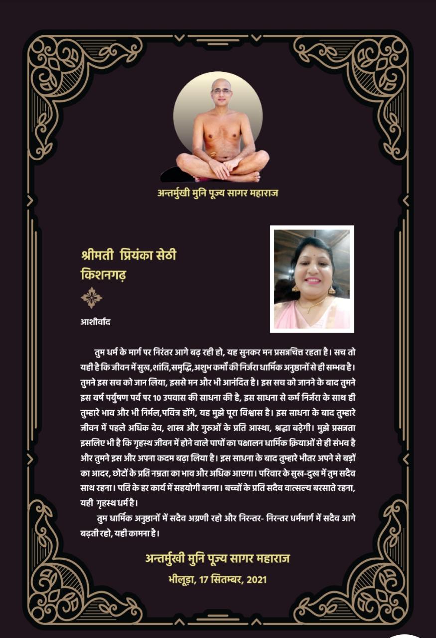 किशनगढ़। जैन समाज के पर्युषण महापर्व चल रहे हैं। पर्युषण महापर्व पर श्रावक-श्राविका साधना के जरिए आत्मशुद्धि कर रहे हैं। किशनगढ़ के संजय सेठी की धर्मपत्नी प्रियंका सेठी की भी 10 उपवास की साधना चल रही है जो 19 सितम्बर को पूरी हो जाएगी। वह दूसरे दिन 20 सितम्बर को पारणा ग्रहण करेंगी। भीलूड़ा (राजस्थान) में चातुर्मास कर रहे अन्तर्मुखी मुनि पूज्य सागर महाराज के संघस्थ तुष्टि दीदी ने किशनगढ़ आकर 10 उपवास की साधना कर रही प्रियंका सेठी को मुनि का आशीर्वचन पत्र, अभिनन्दन पत्र,जापमाला,शास्त्र,दीपक एवं गाय-बछड़े का प्रतीक चिन्ह भेंट किया। इस दौरान तुष्टि के साथ प्रियल जैन इंदौर, आरती जैन किशनगढ़ भी उपस्थित थीं।तुष्टि दीदी ने साथ ही राजेश कोठारी की पुत्री अदिति, नमन,अमन को भी आशीर्वचन पत्र भेंट किया। उल्लेखनीय है कि संजय-प्रियंका सेठी वर्ष 2018 में अन्तर्मुखी मुनि पूज्य सागर महाराज के चातुर्मास के समय उनसे जुड़े थे। मुनिश्री ने आशीर्वचन पत्र में लिखा है-  तुम धर्म के मार्ग पर निरंतर आगे बढ़ रही हो, यह सुनकर मन प्रसन्नचित्त रहता है। सच तो यही है कि जीवन में सुख,शांति,समृद्धि,अशुभ कर्मों की निर्जरा धार्मिक अनुष्ठानों से ही सम्भव है। तुमने इस सच को जान लिया, इससे मन और भी आनंदित है। इस सच को जानने के बाद तुमने इस वर्ष पर्युषण पर्व पर 10 उपवास की साधना की है, इस साधना से कर्म निर्जरा के साथ ही तुम्हारे भाव और भी निर्मल,पवित्र होंगे। तुम धार्मिक अनुष्ठानों में सदैव अग्रणी रहो और निरन्तर- निरन्तर धर्ममार्ग में सदैव आगे बढ़ती रहो, यही कामना है।