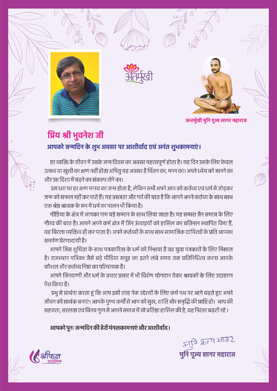 इस धरा पर हर क्षण मानव का जन्म होता है, लेकिन सभी अपने आप को कर्तव्य एवं धर्म से जोड़कर जन्म को सफल नहीं कर पाते हैं। यह प्रसन्नता और गर्व की बात है कि आपने अपने कर्तव्य के साथ साथ एक श्रेष्ठ श्रावक के रूप में धर्म का पालन भी किया है।